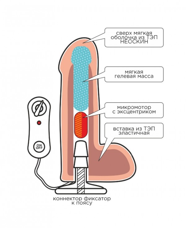 неоскин, с мошонкой, выносной пульт управления, 12 режимов вибрации, 21,5см; диаметр - от 3,5 до 5см